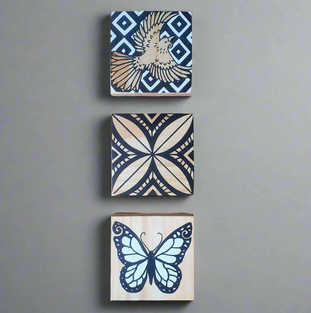 Every artwork is made by Faye from designing, cutting, screen making, framing, sanding, painting and printing.